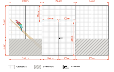 Käfig-Modulen auf einer Fläche von 36 Quadratmeter eine 3 Meter hohe Voliere entstehen. Herausforderung sind hier die zu Gewährleistende Standfestigkeit (Statik und Fundamentbeschaffenheit)